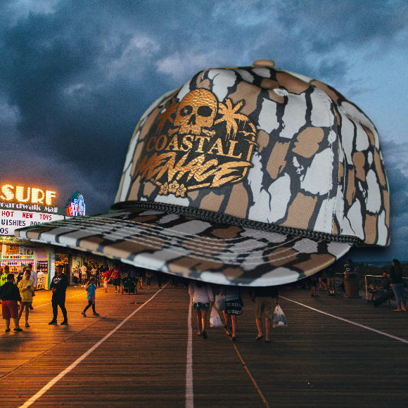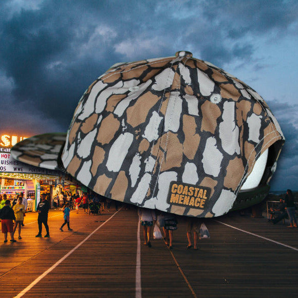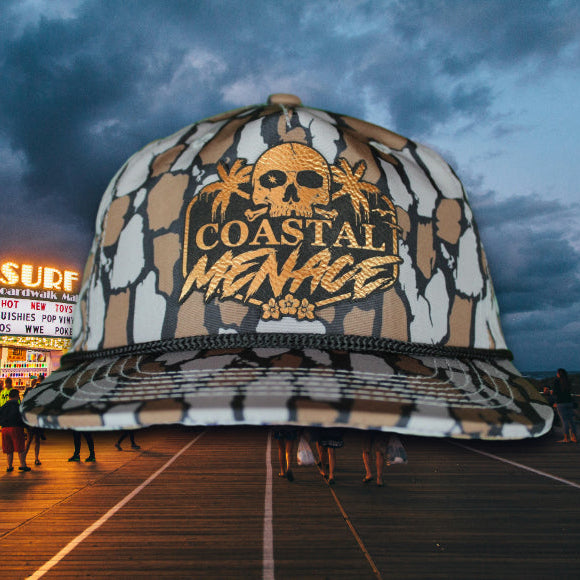 Copper/Black Founding Threat patch. Pine bark camo, water resistant hat with brown rope.